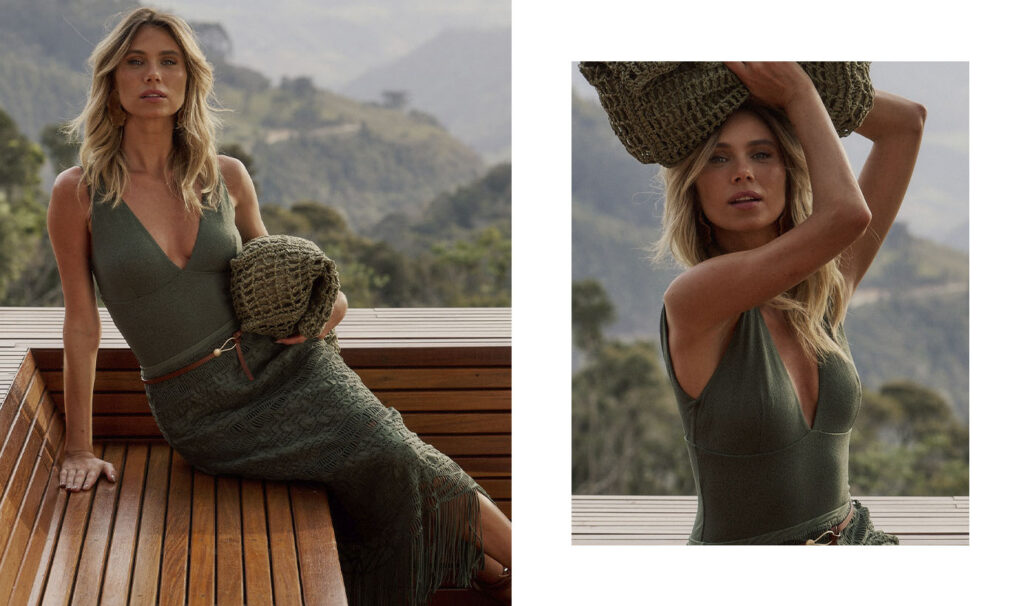 Os biquínis e o Maiô Fio Duplo Pântano apresentam uma malha texturizada que oferece um diferencial para as peças. Já a Saia Rendão Pântano é aquele toque final que transforma o look com charme e autenticidade. Leve e elegante, ela aposta em uma transparência sutil e um caimento delicado, ideal para sobrepor com naturalidade e estilo.