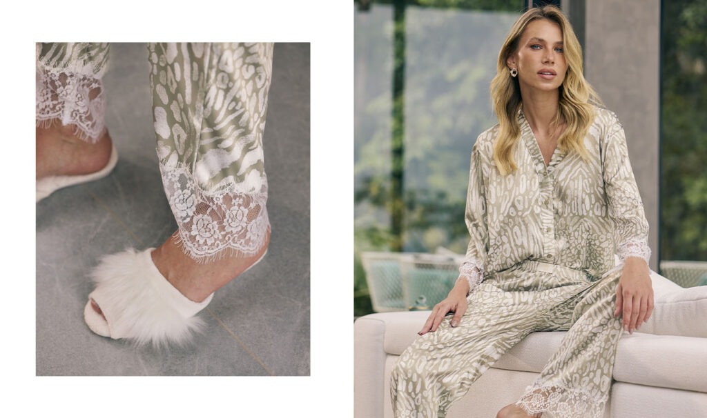 Além do caimento impecável, o cetim proporciona brilho suave e um toque macio que, aliado às estampas sofisticadas e ao cuidado nos acabamentos, tornam o Pijama Leona uma peça que vai muito além do sleepwear. Essa peça é uma experiência de luxo e bem-estar para as suas noites.