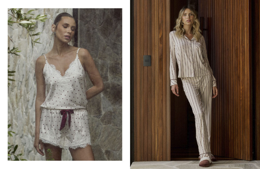 Já o Pijama Longo Americano Caroline, com seu fundo cru e listras finas em bordô, traz uma proposta mais limpa e contemporânea, ideal para noites serenas e cheias de estilo. Confortáveis, refinados e cheios de sutileza, são perfeitos para quem busca beleza até nos momentos de descanso.