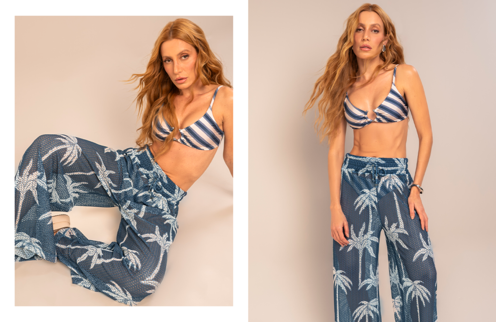 Para viver a praia com leveza, a dica de styling é apostar nas peças da família Maré, que traduzem frescor e charme atemporal. Os biquínis de listras azuis e brancas resgatam o estilo retrô de forma elegante, trazendo aquele mood clássico de verão europeu que nunca sai de cena.