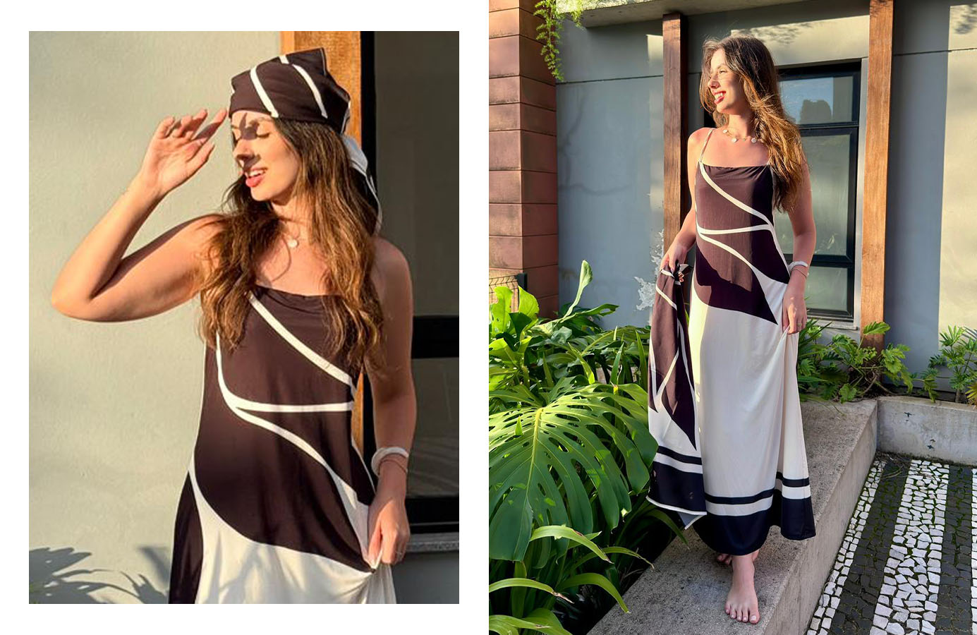 Confeccionado em tecido Capri, a peça tem um toque agradável e leve, garantindo movimento e frescor mesmo nos dias mais quentes. A estampa com desenhos abstratos de folhagens reforça o ar natural do look, enquanto o Lenço Ibiza entra como um detalhe especial no styling: Gabi usou o acessório amarrado na cabeça, trazendo ainda mais personalidade e charme à produção!