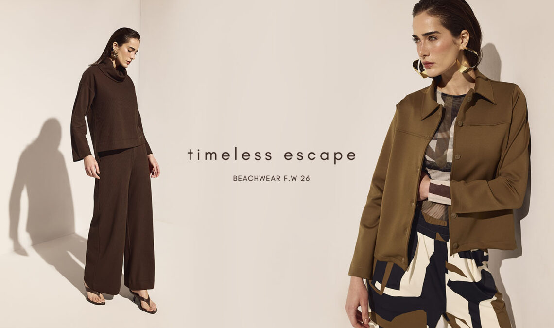 Entre as tendências que atravessam o beachwear contemporâneo, o uso de neutros como base de styling se destaca pela sofisticação e versatilidade. Nesta proposta, as famílias Copenhagem, Lavinia e Giulia constroem uma narrativa visual sofisticada onde modelagens estruturadas encontram estampas fortes e geométricas.