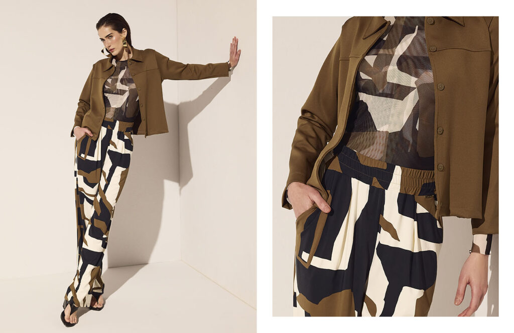 A família Copenhagem apresenta uma proposta intensa e marcante, construída a partir de uma estampa geométrica de estética contemporânea. A combinação de off white, preto e verde erva-mate cria um contraste sofisticado, destacando o desenho da estampa e trazendo modernidade às peças.