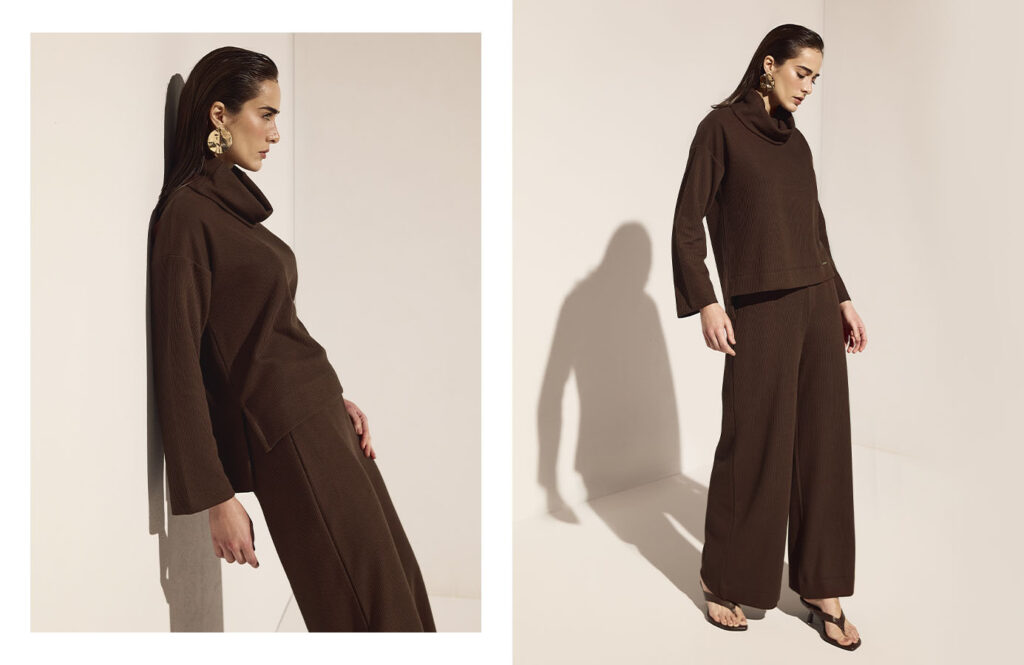 A combinação entre as blusas de manga longa ou curta com a calça de corte amplo forma conjuntos versáteis e fáceis de compor. Disponíveis no marrom chocolate, profundo e intenso, ou no tom supernatural, um off white leve e refinado, as peças funcionam como uma base neutra elegante para produções que valorizam simplicidade, conforto e presença.