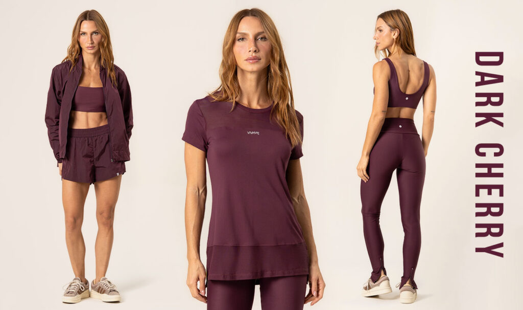 A família Dark Cherry chega como uma proposta que aproxima ainda mais os universos fashion e fitness, trazendo peças pensadas para quem busca estilo sem abrir mão do movimento. O tom profundo de Cereja Laqueada adiciona intensidade à coleção e cria uma estética marcante, que transforma os looks esportivos em produções cheias de personalidade.