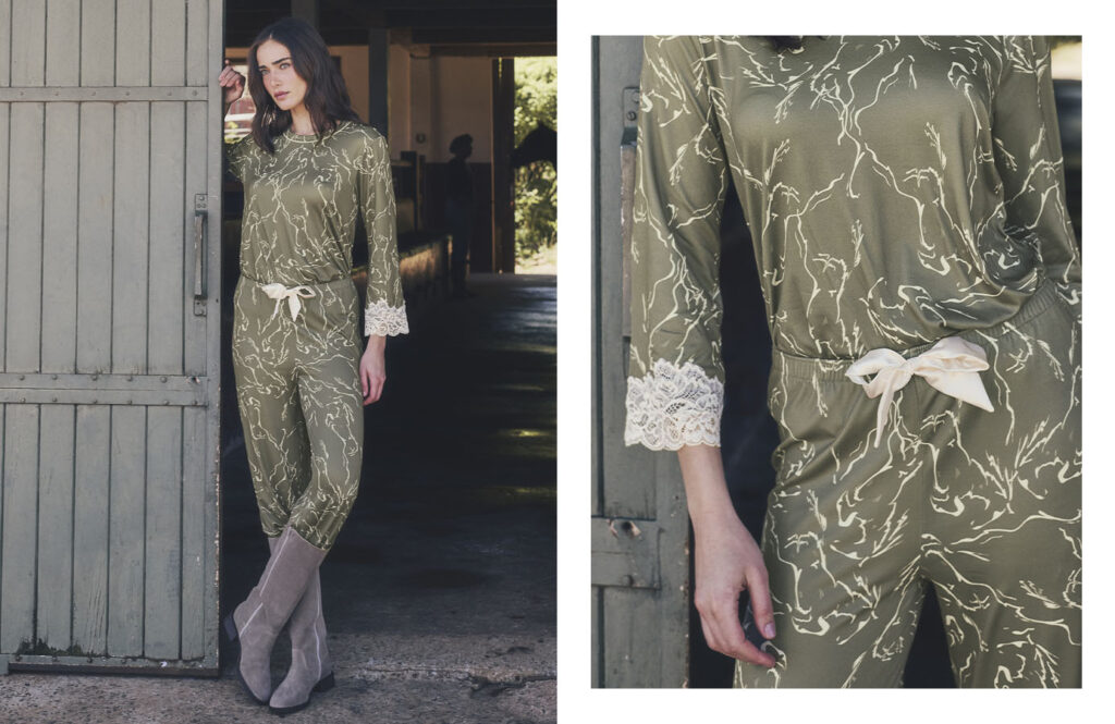 A família Ártemis traz uma proposta elegante e equilibrada, com o verde dusky como destaque, um tom sofisticado que se conecta facilmente com a ideia de conforto e bem-estar. A estampa abstrata, inspirada em formas que remetem a cavalos, adiciona personalidade de forma sutil, enquanto os detalhes em renda branca nas mangas criam um contraste delicado e feminino. As peças foram pensadas para acompanhar momentos de descanso com leveza, com modelagens confortáveis que se ajustam ao corpo sem limitar os movimentos, proporcionando uma sensação agradável do início ao fim do dia.