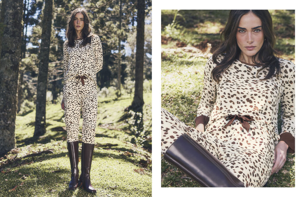 A família Antonella traz referências diretas à estética dos country clubs, com uma proposta leve e descomplicada para os momentos de descanso. Sua estampa, marcada por pequenas manchinhas marrons, cria um visual delicado e cheio de personalidade, sem pesar na composição. As peças seguem uma linha confortável e fácil de usar, com modelagens amplas que acompanham o corpo com naturalidade, garantindo bem-estar e liberdade em todos os momentos.